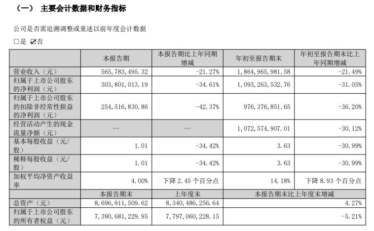 10月底,爱美客发布了第三季度财报。数据显示,今年第三季度公司实现营收5.66亿,同比下滑21.27%;归母净利润3.04亿,同比下滑34.61%,如果算上过去一年的实际表现,爱美客已经连续四个季度出现业绩下滑。