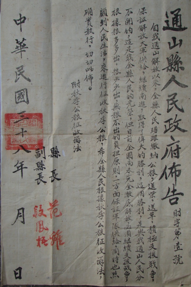 1949年5月通山解放后新政府发布征收秋季公粮的第一份布告